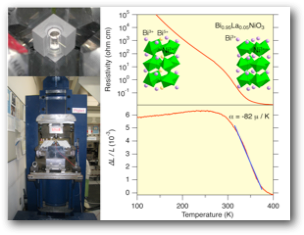 Bi0.95La0.05NiO3。Ni2+からNi3+への酸化に伴い、金属化と、既存材料の3倍もの負の熱膨張を示します。