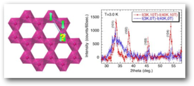 スピン3/2がハニカム(蜂の巣)状に並んだBi3Mn4O12(NO3)。フラストレーションのために反強磁性秩序が阻害されていますが、磁場を印加すると秩序化します。
