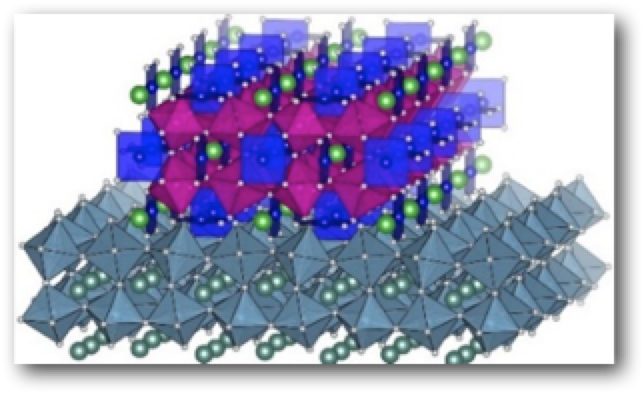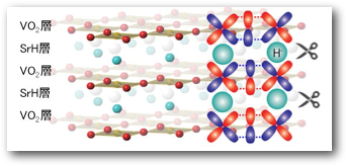 トポケミカル合成によって合成されるSrVO2H。酸化物イオン(O2-)とヒドリド(H-)が層状に秩序化しており、ヒドリドがバナジウムイオンとのπ結合をブロックするとこにより擬二次元的な電子構造を実現しています。