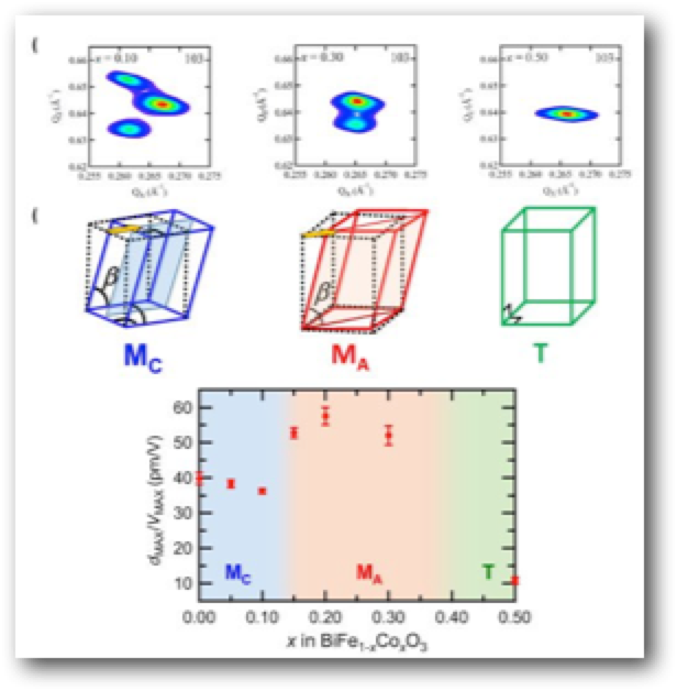 非鉛圧電材料BiFe1-xCoxO3薄膜の逆格子マッピングと、結晶構造変化、そして圧電定数。 電気分極の回転が起こる結晶構造相で、圧電性が増大します。